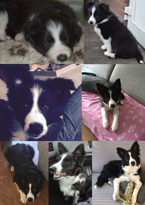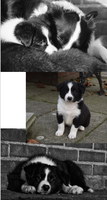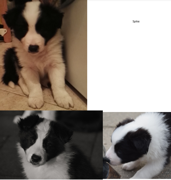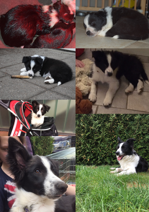 Nest 3: 4 pups waarvan 2 reuen en 2 teven: Flip (bij zijn ouders gebleven) en Sherp. Teefjes Myla en die ander weet ik niet. Sherp heeft extra veel wit waar er ook geen zwart over het oog is en aan die kant heeft hij ook een blauw oog. Dat is nergens van de voorouders waar hij het van heeft kunnen erven. Zo is het ook gegaan met dat er ineens blond in de voorouders was. Uit het niets